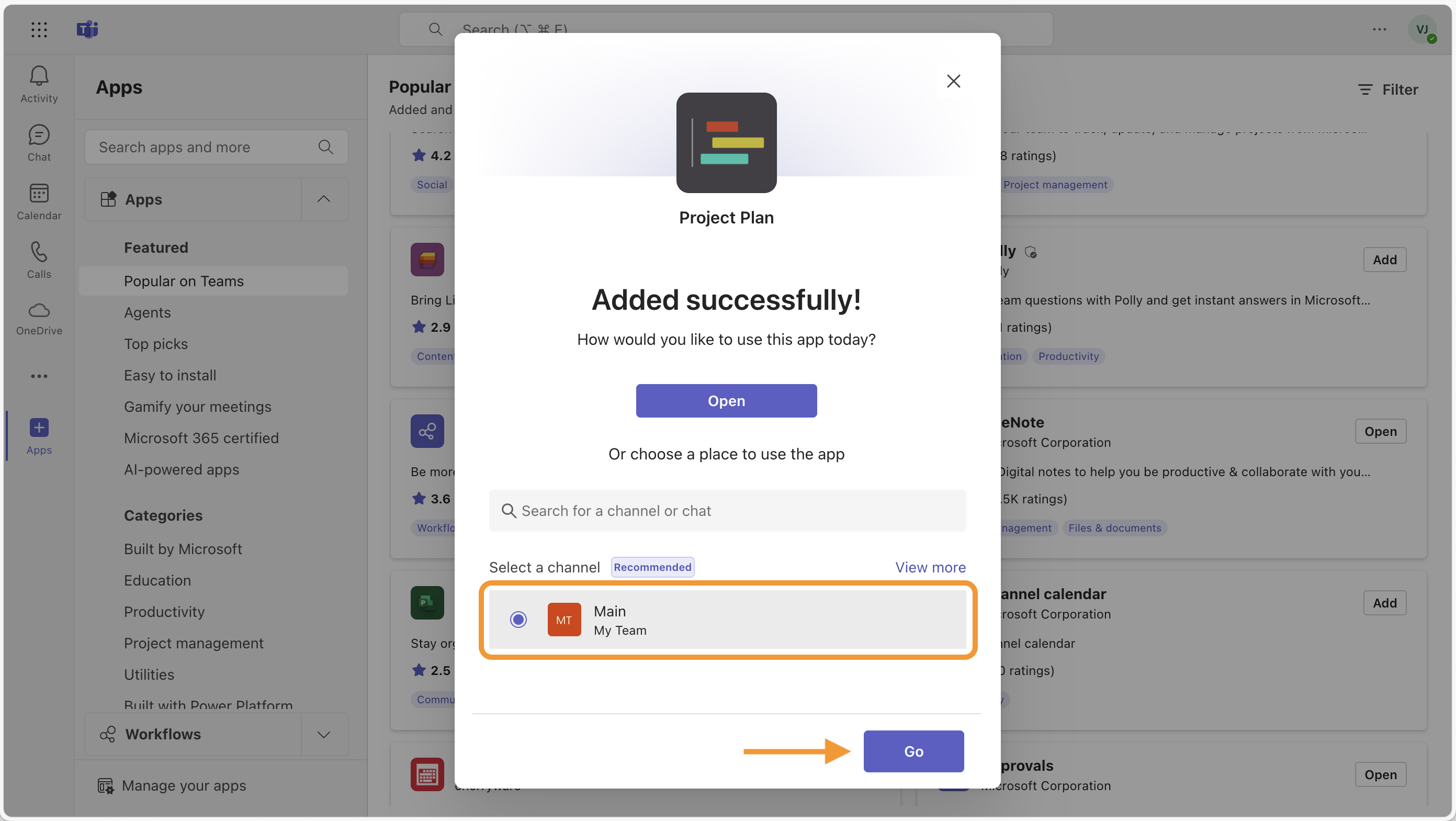 - First, select a channel or chat where you would like to add Project Plan. Then click Go.